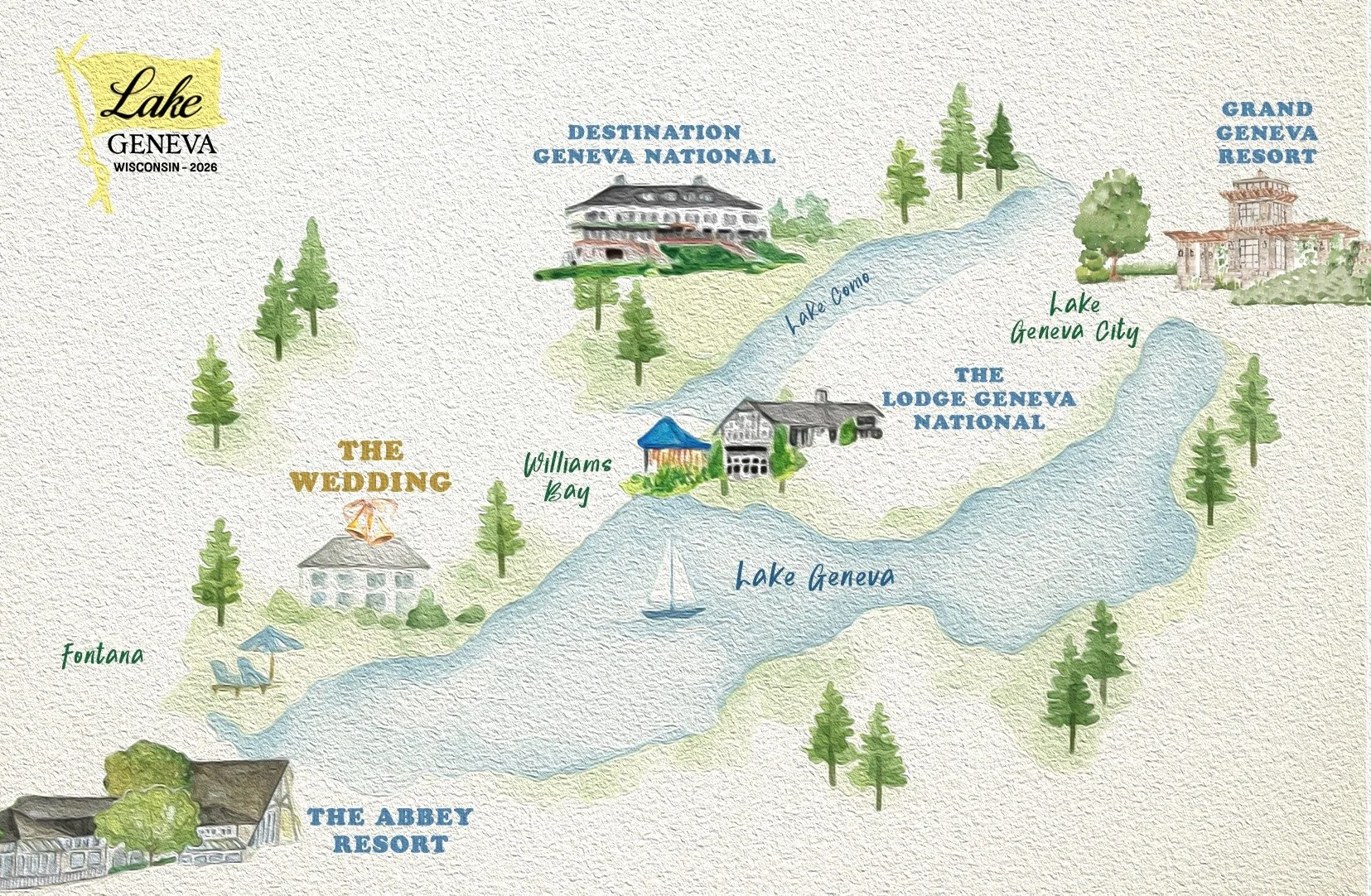 The wedding will take place in Fontana on the west side of Lake Geneva. While the celebration is centered here, many of the recommended hotels and restaurants are in nearby towns such as Williams Bay or Lake Geneva City. Everything is close by since each town circles the lake. No matter where you are staying it is an easy drive of under 25 minutes.